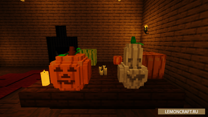 Мод на тыквы для Хэллуина Halloween Pumpkins and Jack'O Lantern добавляет в игру два новых варианта тыкв для светильника Джека, которые отлично подойдут для праздника Хэллоуин. Данные варианты светильников и тыкв выполняют чисто декоративную функцию, а скрафтить их можно на верстаке. Отличное украшение для вашего дома.